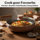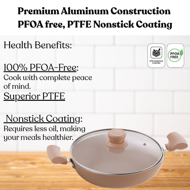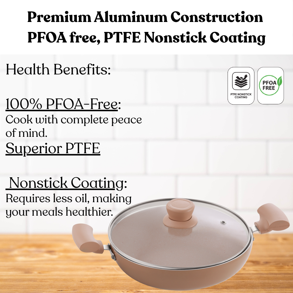 Add elegance and efficiency to your cooking routine with the Biscoff Kadhai with Glass Lid. Designed for everyday convenience, it features a superior non-stick coating that ensures smooth food release and minimal oil usage. The tempered glass lid locks in flavor and moisture, while the warm biscoff finish adds a touch of sophistication to your kitchen. Ideal for sautéing, frying, and preparing curries, this kadhai blends beauty with performance.