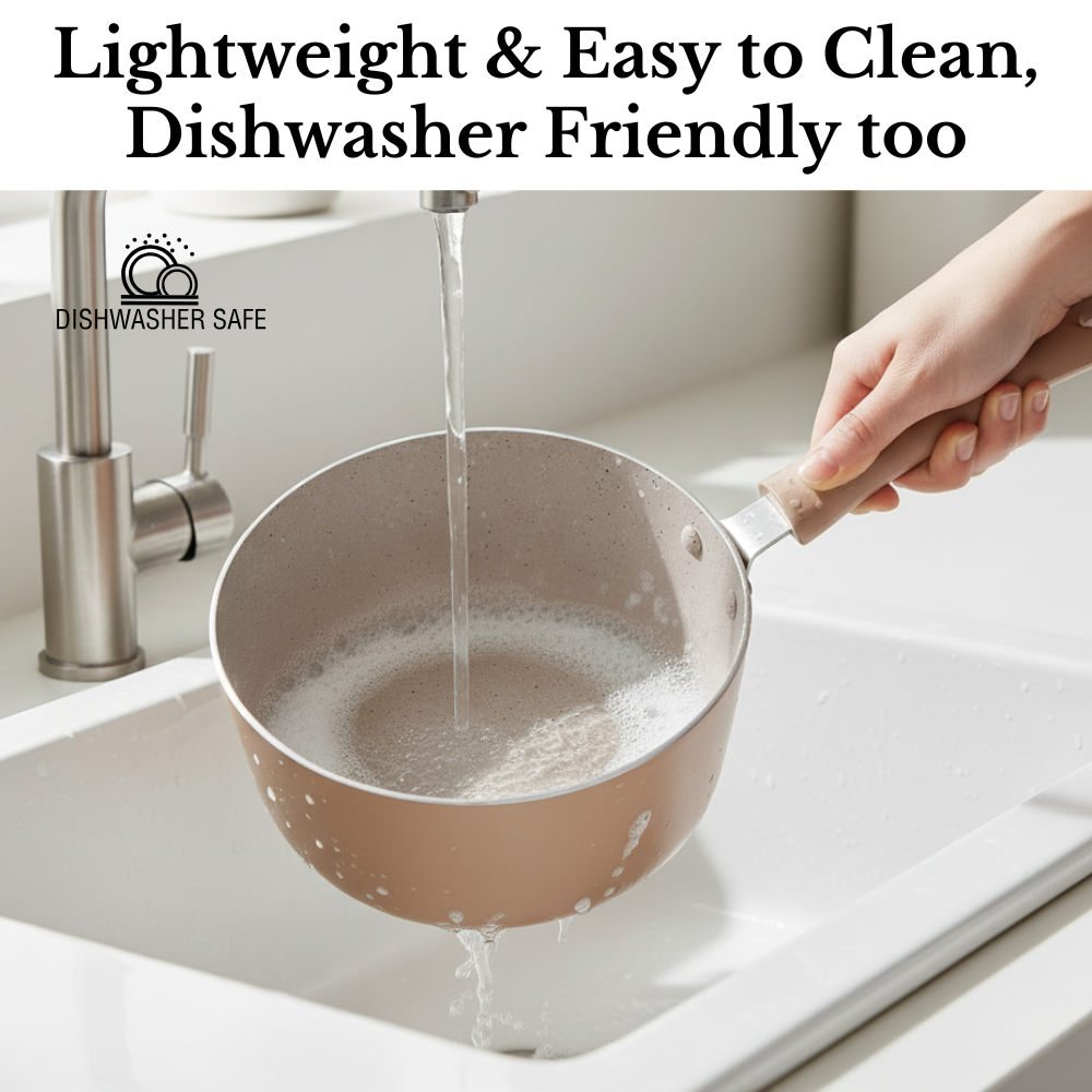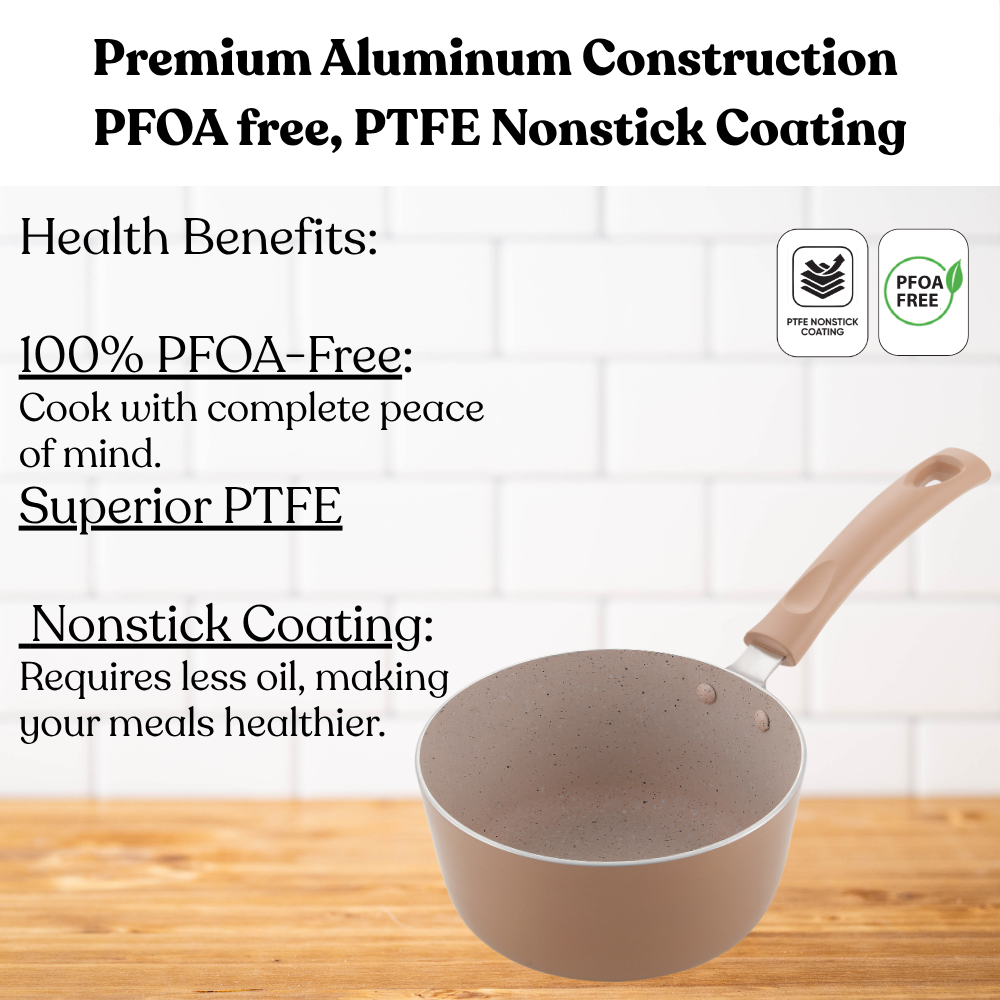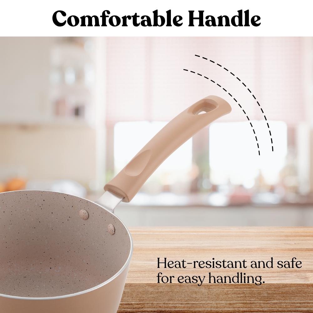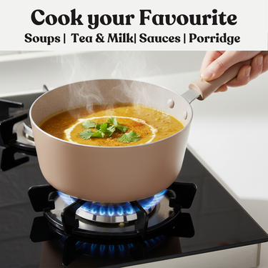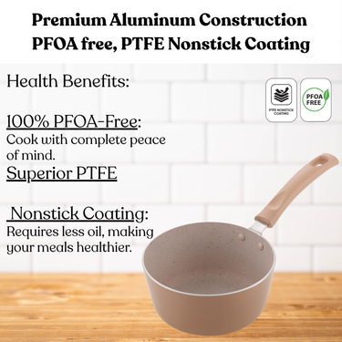 Experience effortless cooking with the Biscoff Sauce Pan with Glass Lid, perfect for soups, sauces, milk, and gravies. Crafted from premium aluminum with a smooth non-stick coating, it ensures even heating and easy food release. The tempered glass lid allows you to monitor cooking while keeping flavors locked in. With its elegant biscoff-toned design and soft-touch handle, this pan combines everyday convenience with refined style.