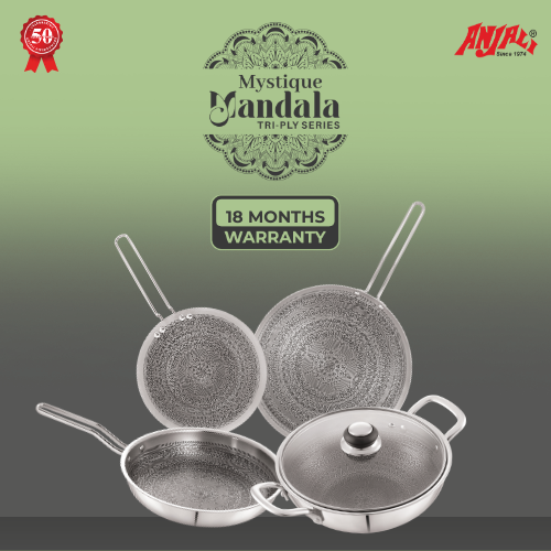 Rooted in the rich heritage of Indian art, the Mystique Mandala Roti Tawa brings timeless elegance and superior performance to your kitchen. Adorned with intricate mandala patterns, this Roti Tawa seamlessly combines tradition with modern tri-ply technology. It ensures even heat distribution for perfectly puffed rotis, chapatis, and parathas every time, while adding an artistic charm to your cooking space.