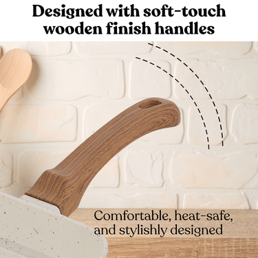 Soft-Touch Wooden Finish Handle: Comfortable, heat-resistant, and elegant.