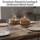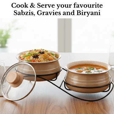 The Mocha Aura Nonstick Handi Set brings elegance and everyday convenience to modern kitchens. Crafted with a durable nonstick coating and finished in a warm mocha shade, this set is designed for effortless cooking, serving and easy cleaning. Each handi includes a glass lid for clear visibility while cooking and comes with a coordinated metal stand for neat and stylish table placement.