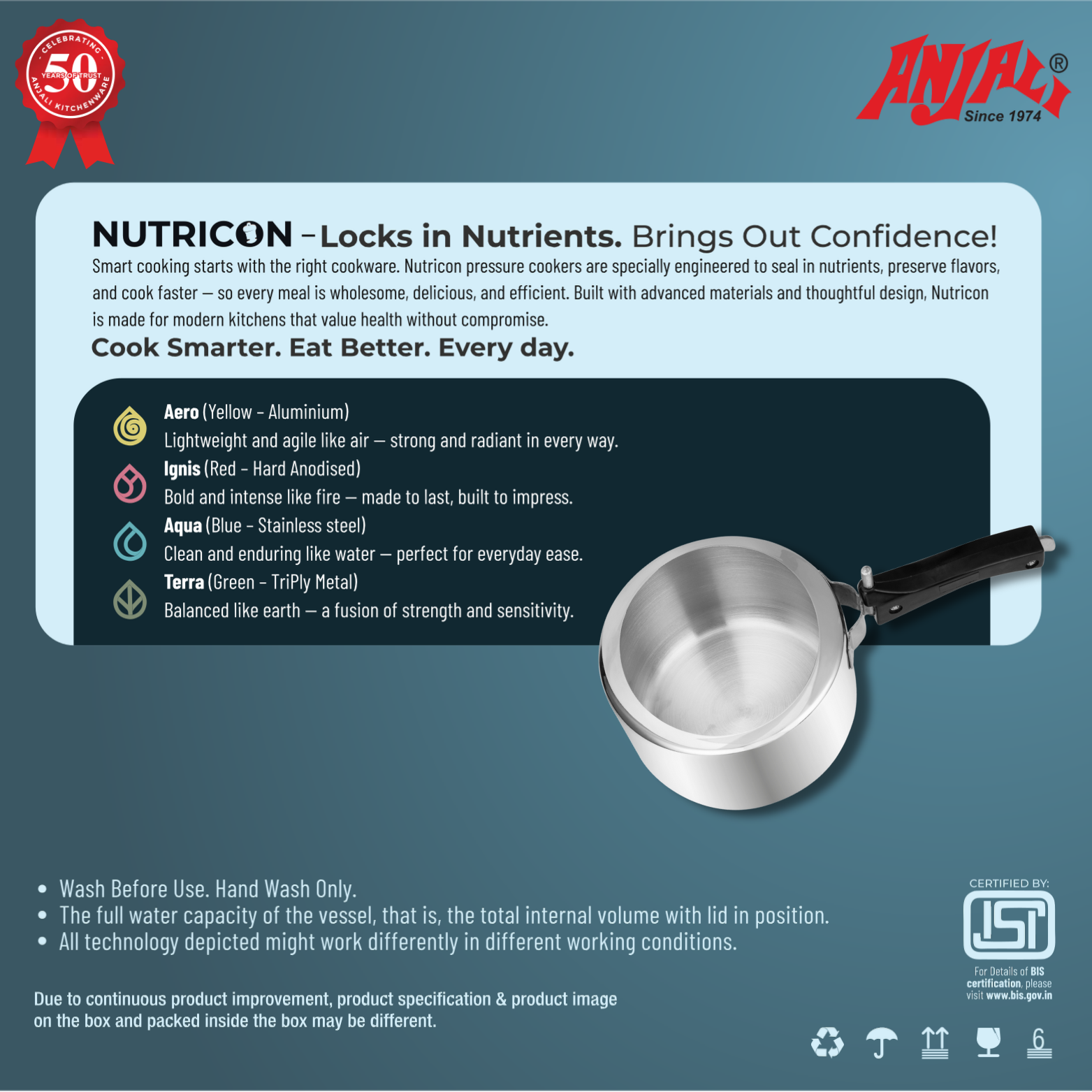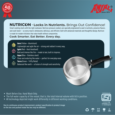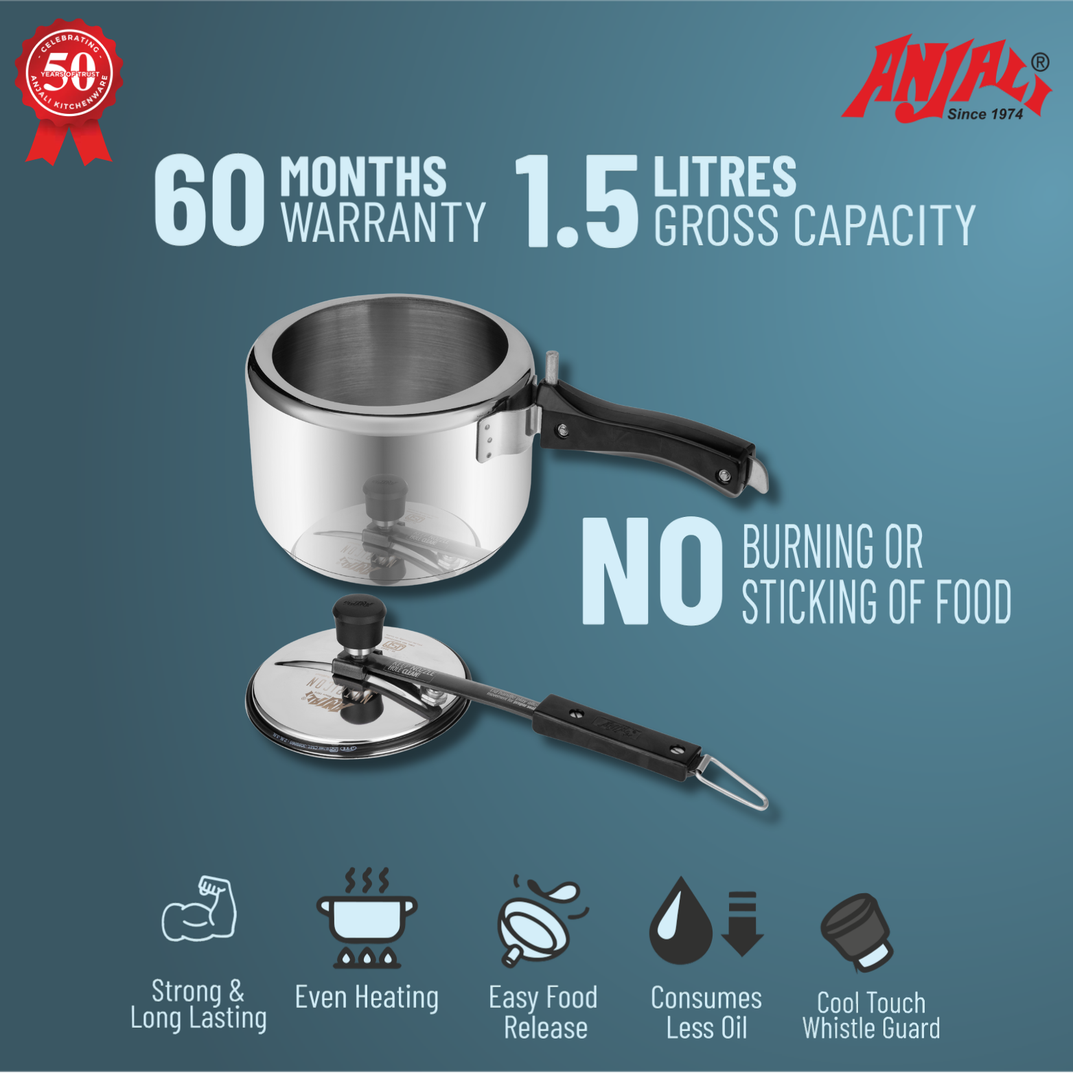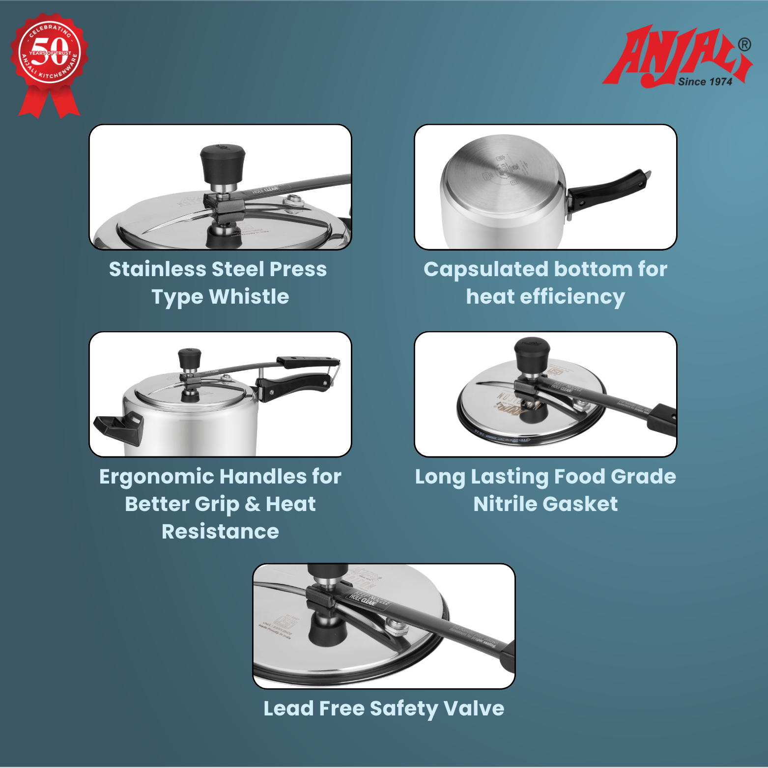 The Anjali Aqua Stainless Steel Inner Lid Pressure Cooker is designed for efficiency, reliability, and long-term durability. Crafted from high-quality stainless steel, it ensures consistent performance for everyday cooking needs. The inner-lid design provides enhanced pressure retention, while its induction-friendly base makes it suitable for modern kitchens.