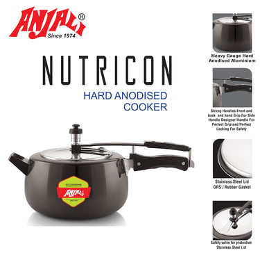 Cook faster, healthier, and with long-lasting durability using our ANJALI Hard Anodized Inner Lid Pressure Cooker. Crafted from premium virgin aluminium and treated with a hard anodized finish, this cooker offers superior heat conduction, even cooking, and exceptional corrosion resistance. The inner lid design ensures extra safety by locking in steam until pressure drops naturally, making it ideal for rice, dal, curries, and more.